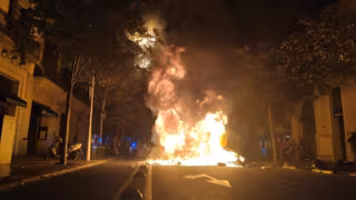 Por ahora no hay presencia policial, ya que están rodeados por barricadas que los Bomberos de Barcelona están tratando de apagar, y un helicóptero sobrevuela la zona.