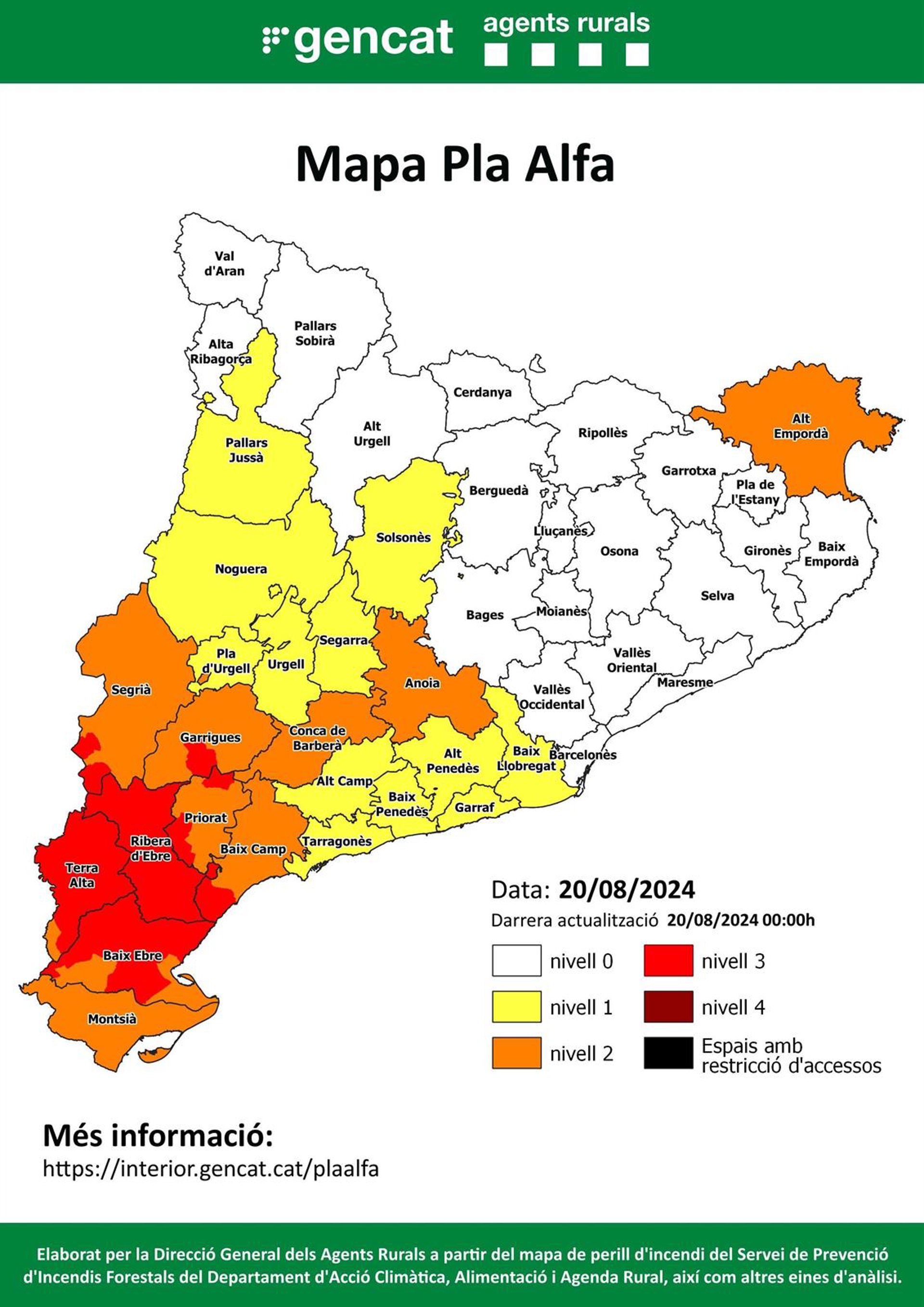 Dicho mapa muestra los niveles de riesgo de incendio en el marco del Plan Alfa y las localidades en nivel 3 (peligro muy alto de incendio), que en la provincia de Tarragona se encuentran en las comarcas de les el Baix Camp, el Baix Ebre, el Priorat, la Ribera d'Ebre y la Terra Alta.