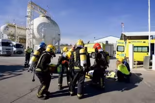 El ejercicio, organizado por la Dirección General de Protección Civil de la Generalitat y la empresa, ha consistido en un escape de dióxido de azufre al romperse una manguera de descarga, con una posterior nube tóxica que se ha ido desplazando con el viento obligando al confinamiento de los colegios y afectando a un mercado municipal.