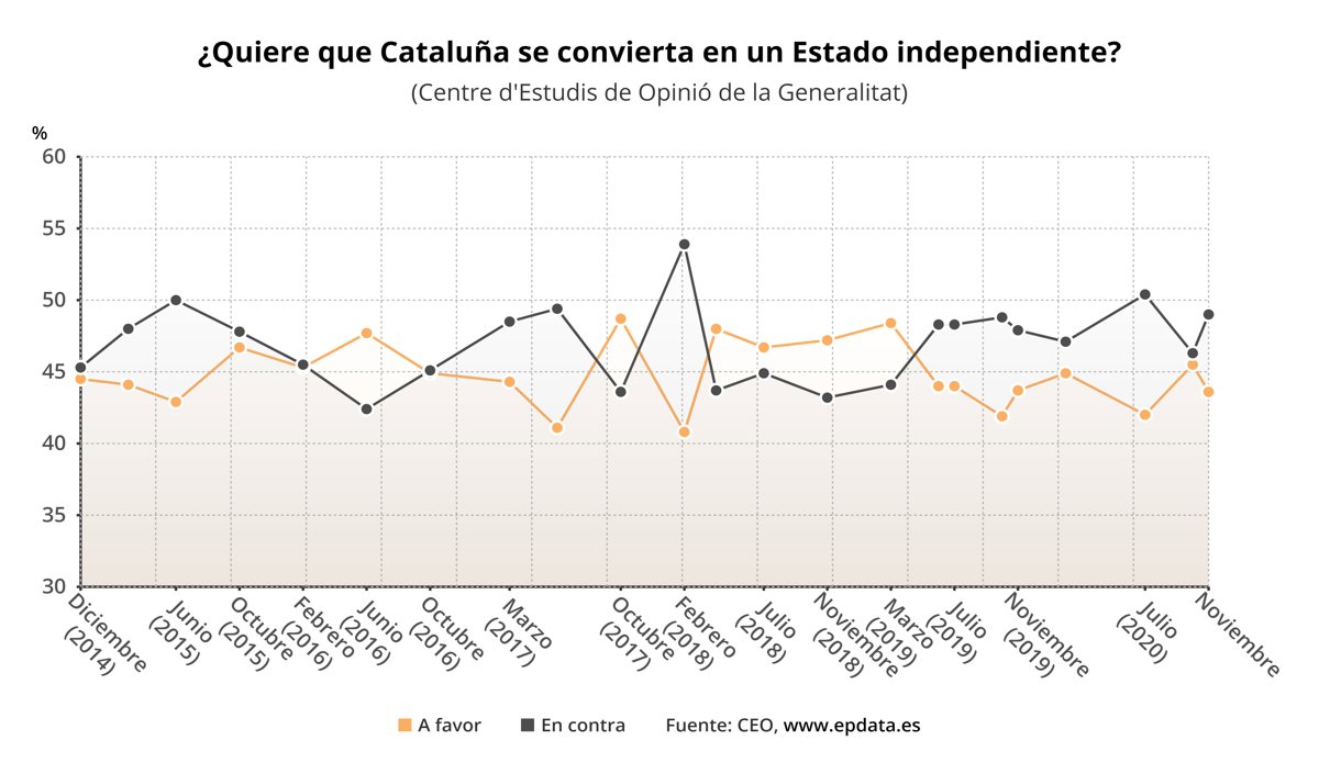 Estos resultados muestran la misma tendencia de las encuestas del CEO desde 2019 de que el 'no' está por encima del 'sí', aunque la diferencia va variando: respecto a la última encuesta publicada por el CEO en octubre la distancia entre las dos posiciones se ha ensanchado --46,3% por el 'no' y 45,5% por el 'sí'--, pero se ha acortado en comparación con el segundo Barómetro de julio, en la que el 'no' ganaba con un 50,5% y el 'sí' tenía un 42%.