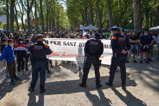 Unos 50 manifestantes han protestado este viernes por la tarde ante la parada de rosas y libros de Vox en el paseo de la Devesa de Girona, y los Mossos d'Esquadra han impedido que se acercasen.
