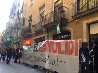 La acción "denuncia la impunidad por el genocidio contra miles de palestinos" y se enmarca en la manifestación convocada este sábado a 18 horas en Barcelona bajo el lema 'Paremos el genocidio en Palestina, basta comercio de armas con Israel'.