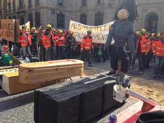 Los Bomberos, que han tirado numerosos petardos, han escenificado la muerte del servicio colocando cuatro ataúdes y un muñeco de un bombero crucificado encima, y les han prendido fuego antes de iniciar una marcha a plaza Sant Jaume, presidida por la pancarta 'Los Bomberos también somos estructura de Estado'.