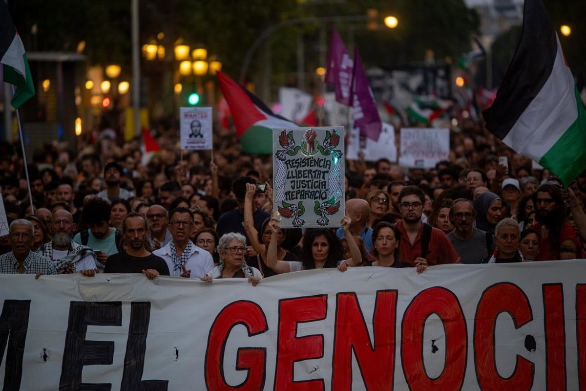 Bajo el lema 'Aturem el genocidi' ('Paremos el genocidio'), y con cánticos como 'Palestina libre', 'Dónde están, no se ven, las sanciones a Israel' o 'Boicot, sanciones, desinversiones', se han concentrado en Plaça Catalunya.