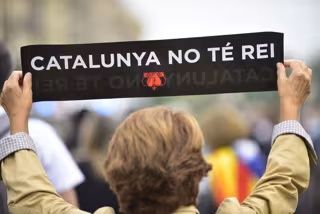 Una mujer sostiene una pancarta donde se puede leer "Cataluña no tiene Rey" en la cadena humana formada como signo de protesta por la visita del Rey a Barcelona, Catalunya, (España), a 9 de octubre de 2020. - David Oller - Europa Press