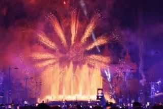 Además de los fuegos artificiales, en sintonía con el espectáculo musical, también ha tenido protagonismo la iluminación de las fuentes de la avenida y de la fachada del Palacio Nacional de Montjuïc.