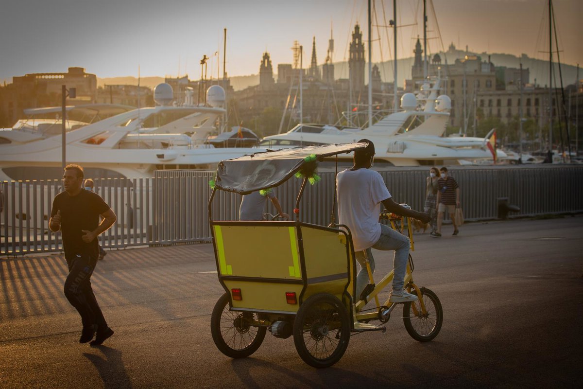 Un hombre monta en una bicicleta-taxi por Barcelona, Catalunya (España), a 28 de julio de 2020. - David Zorrakino - Europa Press