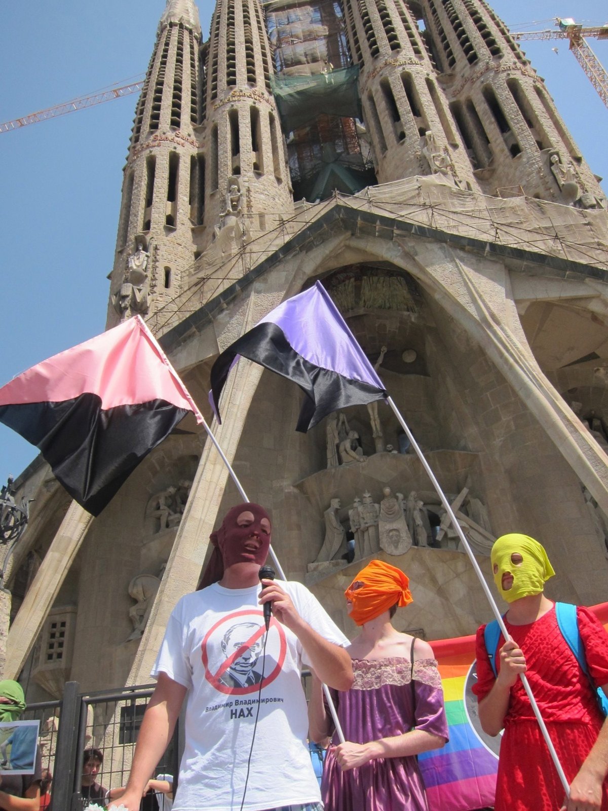 Ante centenares de turistas animados y sorprendidos por la protesta, una quincena de personas ataviadas con medias en el rostro y disfrazadas con minifaldas, al estilo Pussy Riot, se han citado ante la basílica barcelonesa, en un acto celebrado en una cincuentena de ciudades de todo el mundo.