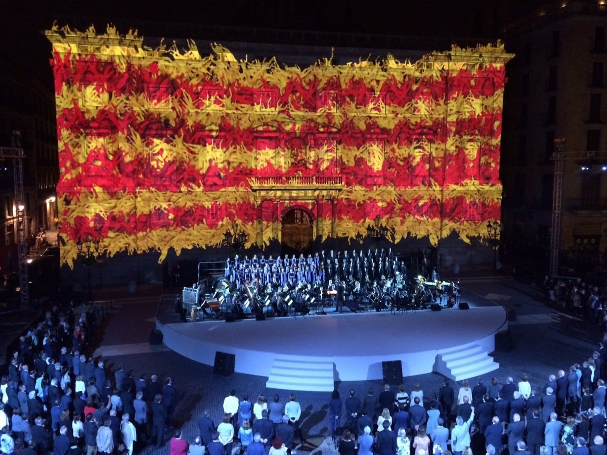 Antes del mapping, la primera fase del acto ha sido un espectáculo teatral que ha revindicado la lengua y la cultura como factores esenciales de la identidad catalana, y que demuestran la vocación de Catalunya de "pertenecer vocacionalmente a Europa por filiación directa".