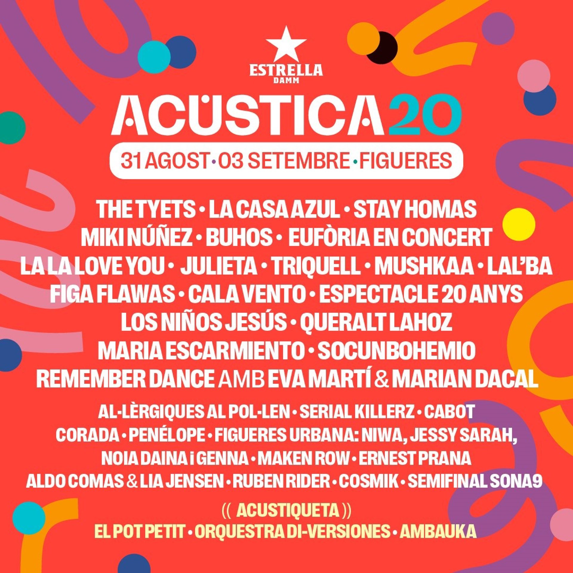 El festival Acústica, que se celebra desde el jueves hasta el domingo en Figueres (Girona), contará con las actuaciones de The Tyets, Queralt Lahoz, Cala Vento, Stay Homas, La Casa Azul, La La Love You, María Escarmiento y un especial dedicado al 20 aniversario de la iniciativa.