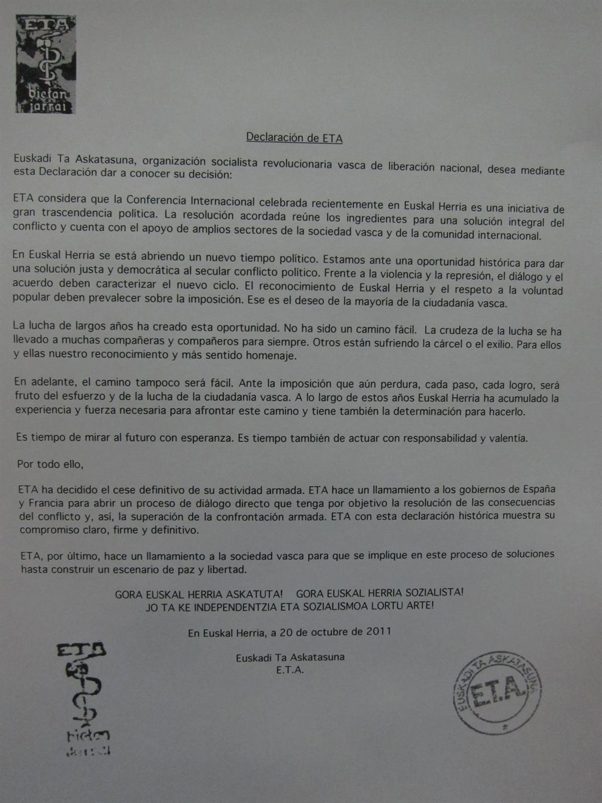 Sin embargo, ha señalado que cualquier paso encaminado a la disolución definitiva de ETA será bienvenido, aunque ha sostenido que cree que el comunicado va destinado "a justificar a que otros freaks vinieran el lunes al País Vasco a la conferencia por la paz".