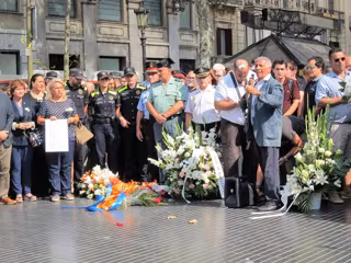 En la ofrenda han participado representantes de víctimas del terrorismo, como la presidenta de la Fundación Víctimas del Terrorismo y diputada del PP, Mari Mar Blanco, y familiares de víctimas del atentado del 17 de agosto, así como representantes de la Guardia Civil, la Policía Nacional, los Mossos d'Esquadra y la Guardia Urbana de Barcelona, y también políticos del PP, Cs, PSC y VOX.