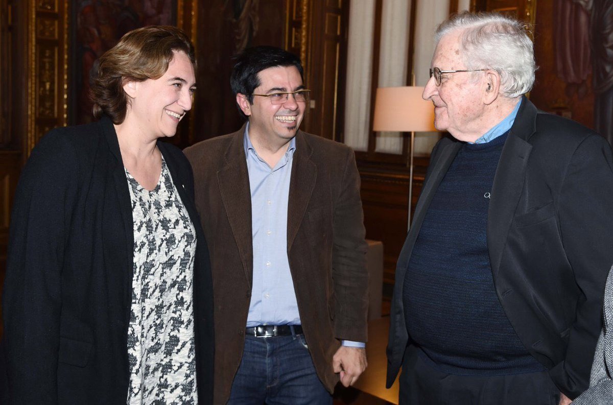La alcaldesa de Barcelona, Ada Colau, ha recibido este lunes al lingüista estadounidense Noam Chomsky en el Ayuntamiento de Barcelona junto al primer teniente de alcalde, Gerardo Pisarello.