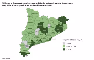Por nacionalidad, los extranjeros han crecido en 38 comarcas y Aran, mientras que el incremento de afiliados de nacionalidad española es "más discreto" y disminuye en cuatro comarcas.