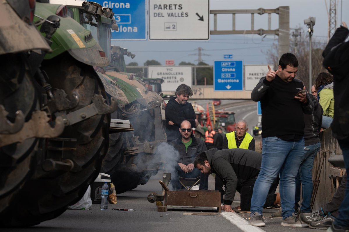 Varias personas entre los tractores que han cortado la carretera C-17, sentido sur, a la altura de Parets del Vallès, a 6 de febrero de 2024 - David Zorrakino - Europa Press
