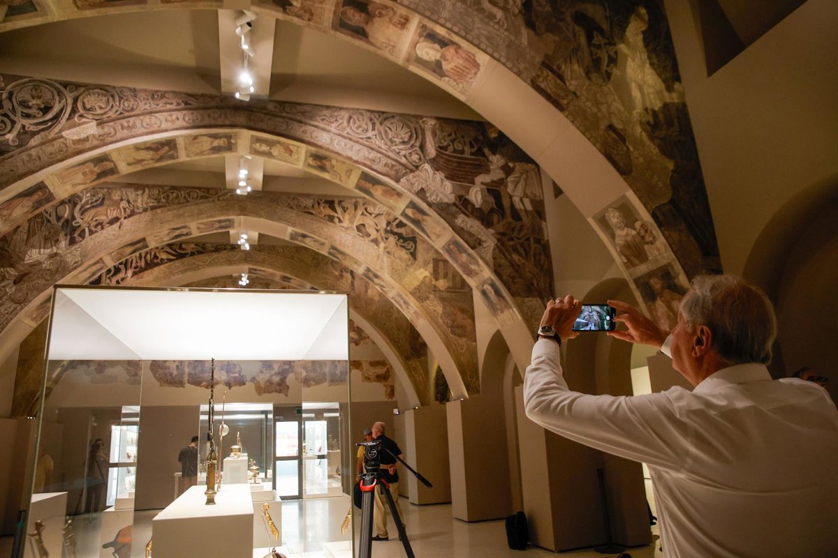 Archivo - Un hombre fotografía las pinturas murales del Monasterio de Sijena expuestas en el Museu Nacional d’Art de Catalunya (MNAC), a 29 de mayo de 2025 - Kike Rincón - Europa Press - Archivo