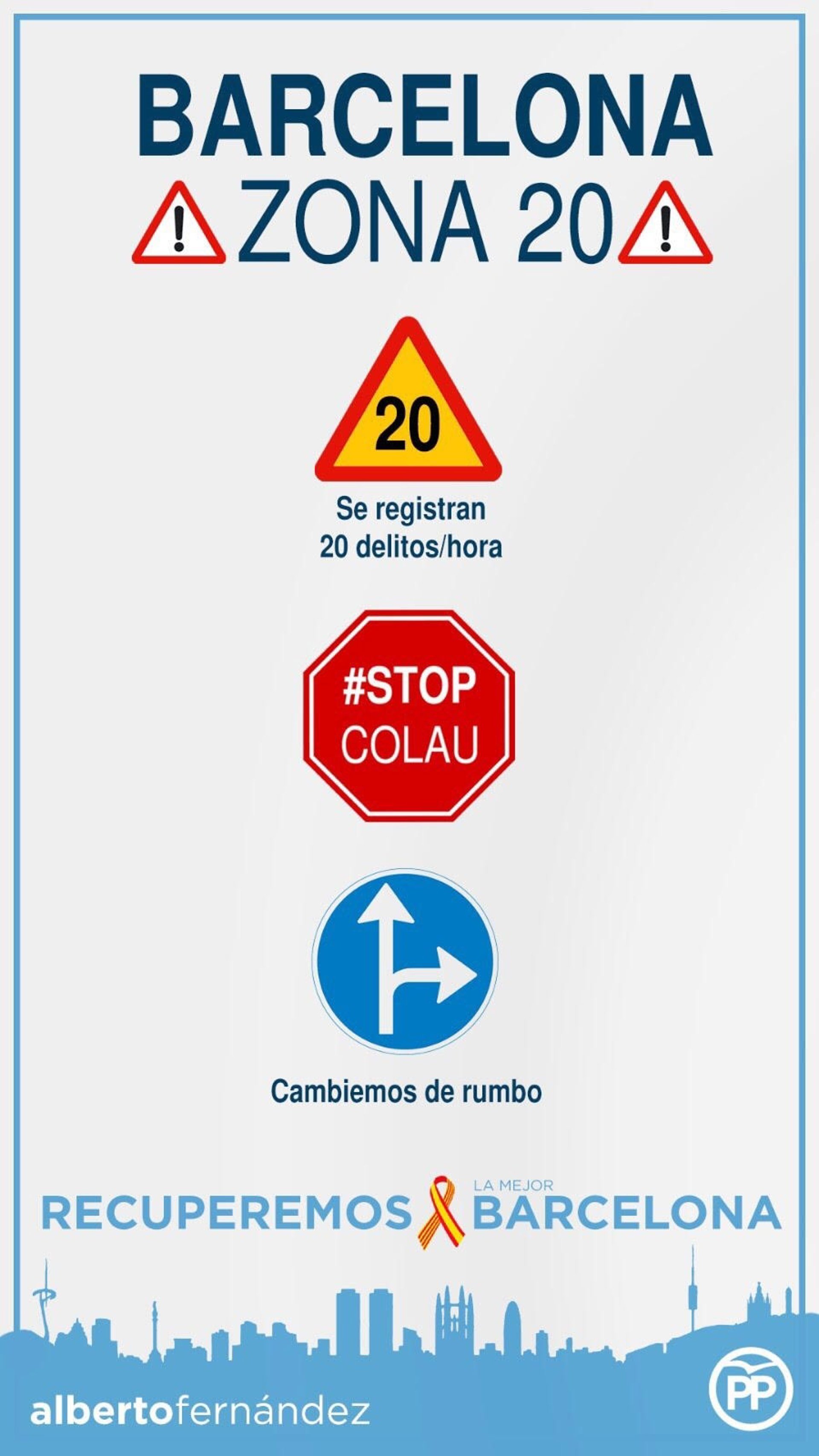 La campaña muestra una señal de peligro con un número 20 en su interior en referencia a la cifra de delitos, además de una señal de 'stop' con el hashtag #StopColau --utilizado desde hace tiempo por el PP de Barcelona--, y al que se suma una señal de obligación para decir a los barceloneses que es necesario un cambio de dirección.