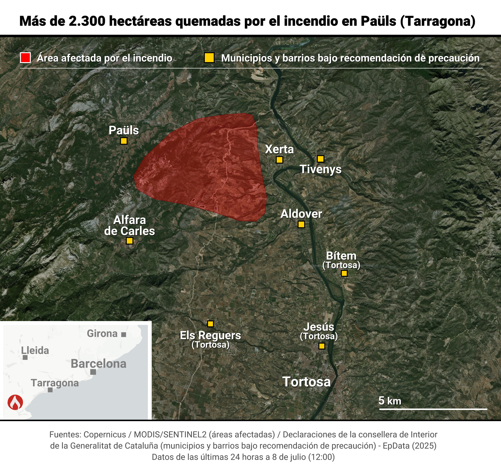 Por su parte, el alcalde de Xerta, Roger Aviñó, ha detallado en una entrevista en el mismo medio que el pueblo se ha "salvado de milagro", ya que se ha quemado un 80% de todo el término municipal.