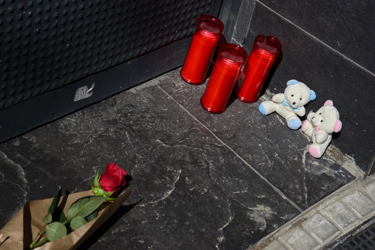 Una rosa, tres velas y dos osos de peluche en la puerta del garaje de la vivienda donde un hombre ha matado presuntamente a su mujer y sus dos hijos menores, 10 de abril de 2024, en El Prat de Llobregat, Barcelona, Catalunya (España). Los Mossos d'Esquadr - Alberto Paredes - Europa Press