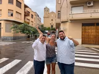 El alcalde de Alcarrs, Jordi Janés, con una de las actrices de la película, Montse Oró, y el concejal Gerard Companys, concejal de cultura y uno de los extras en la película, este martes en Alcarrs - AYTO.DE ALCARRS