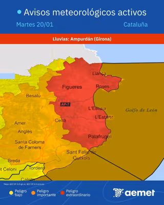 La Agencia Estatal de Meteorología (AEMET) ha activado la alerta roja por lluvias torrenciales en el Alt Empordà y el Baix Empordà (Girona) este martes sobre las 10.58 horas.