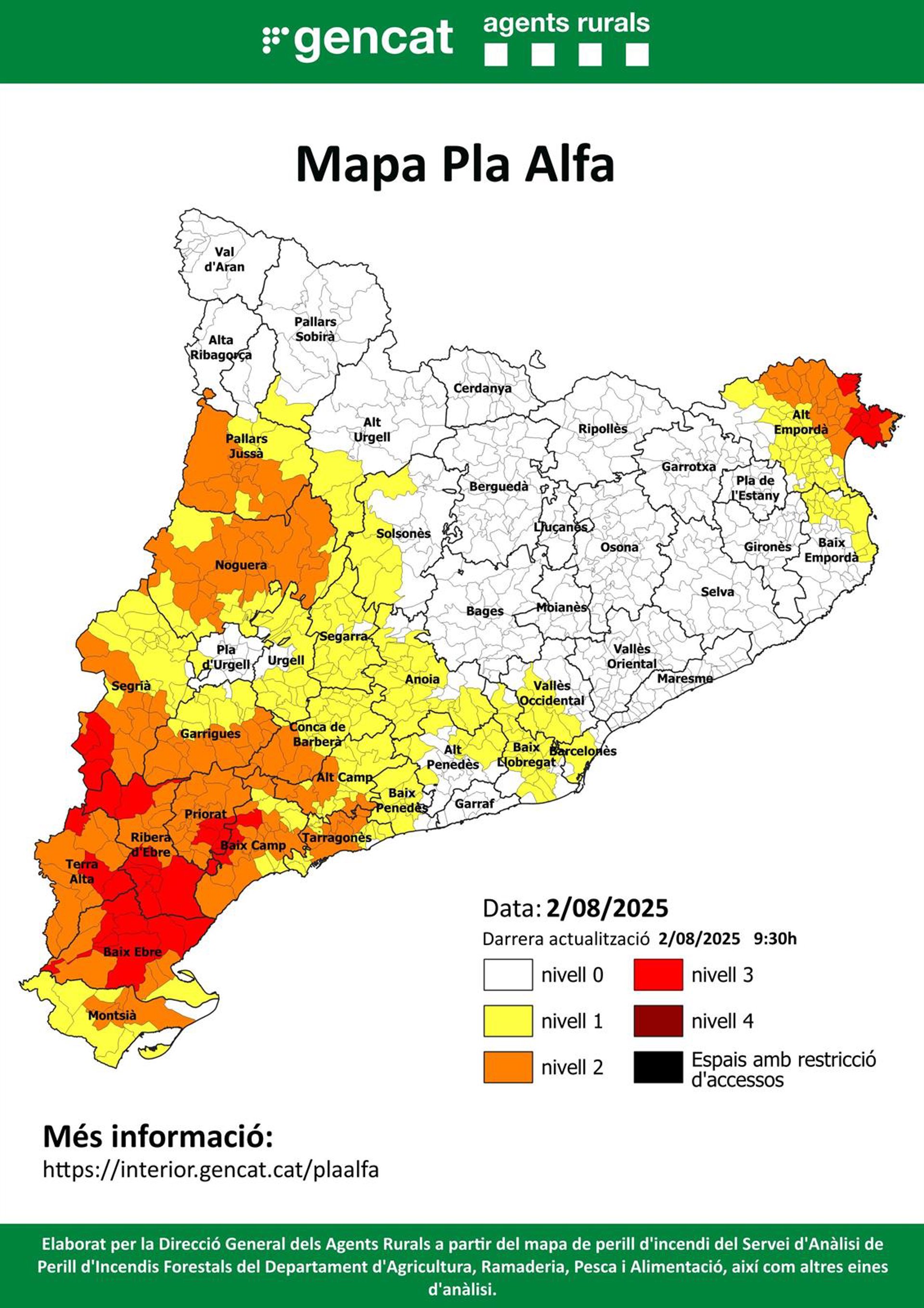 En la comarca se restringirán los accesos en los espacios naturales de Cap de Creus y Serra de l'Albera (Girona), y Bombers se reforzará en las zonas con más riesgo de incendio, informa la Generalitat este sábado en un comunicado.