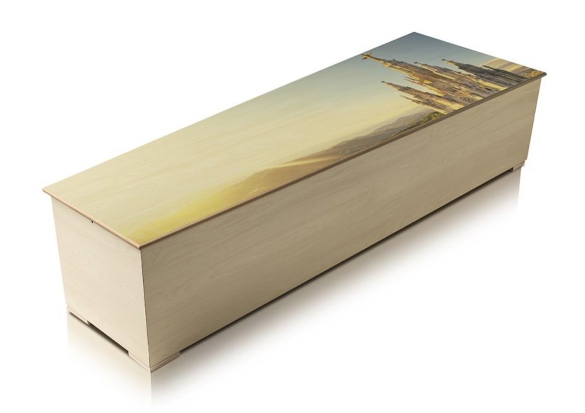La empresa funeraria Áltima ha presentado este año ataúdes de madera sin elementos contaminantes con la posibilidad de imprimir grandes imágenes en la tapa con tinta no contaminante, con imágenes religiosas o laicas, tales como San Jorge, el mar Mediterráneo, el Tibidabo, un paisaje de viñedos o un ángel.