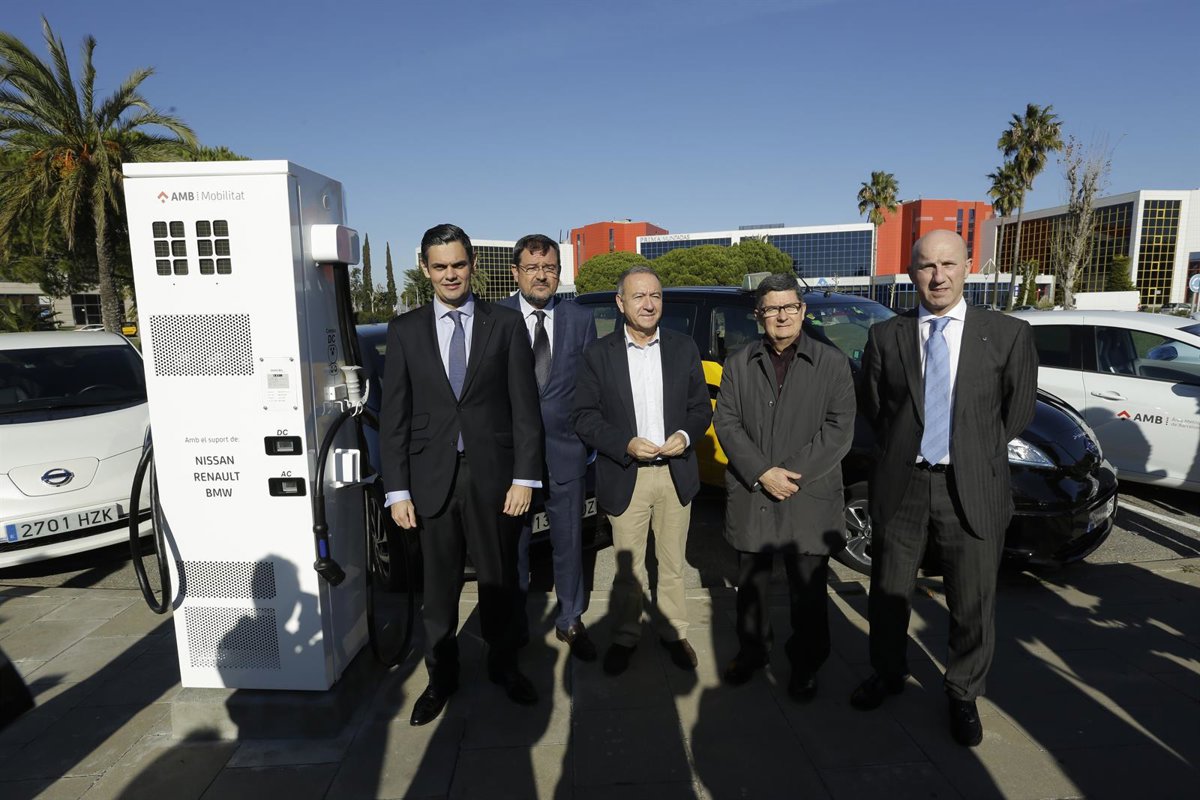 El vicepresidente de Movilidad y Transporte del AMB, Antoni Poveda, y el alcalde de El Prat de Llobregat, Lluís Tejedor, han inaugurado este lunes el punto de recarga del polígono Mas Blau, junto con representantes de las empresas Nissan, Renault y BMW, con las que el AMB tiene suscritos convenios de colaboración en el ámbito del vehículo eléctrico.