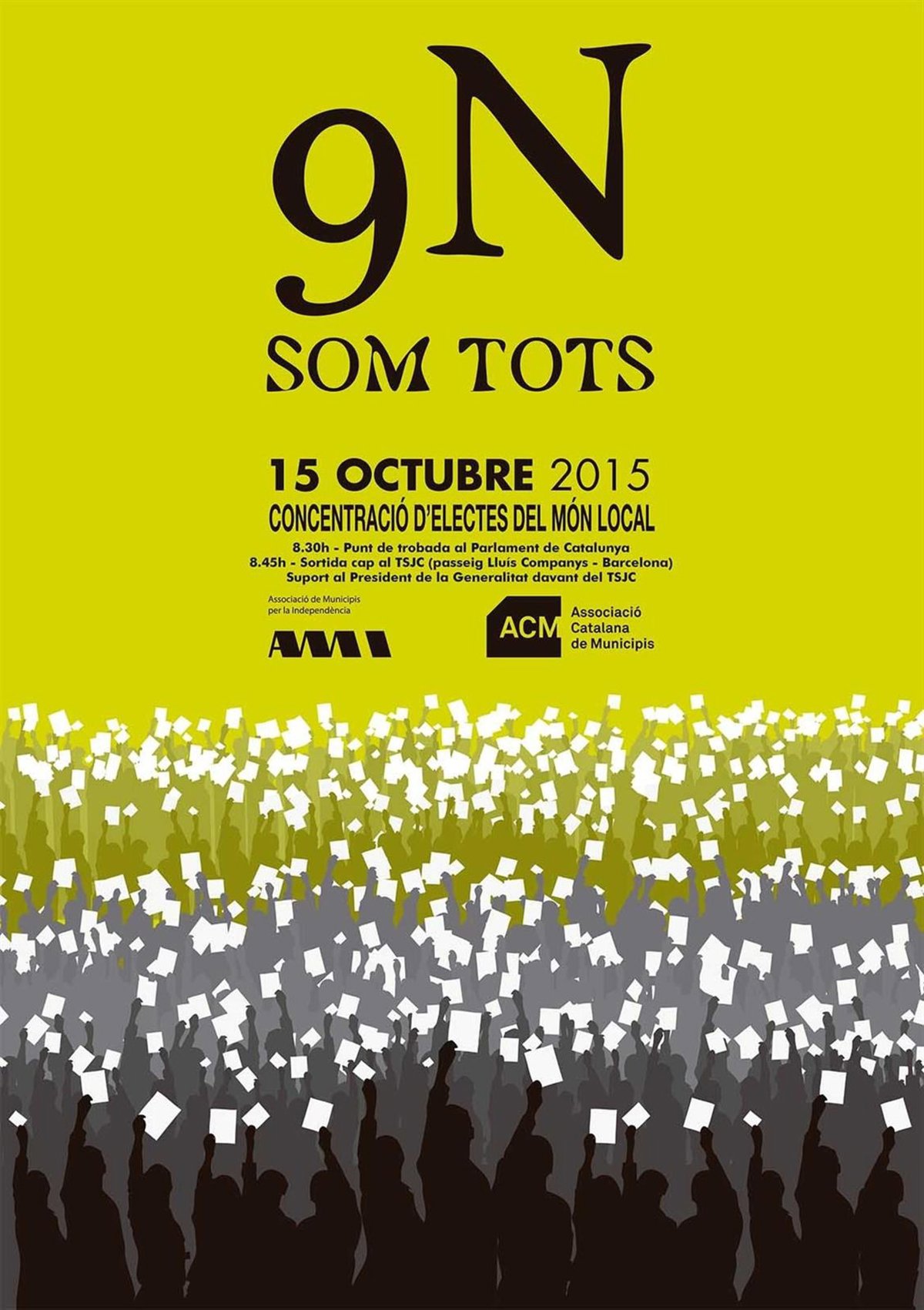 La Asociación de Municipios por la Independencia (AMI) y la Asociación Catalana de Municipios (ACM) han convocado a los alcaldes y concejales catalanes a una concentración este jueves a las 8.30 horas ante el Parlament para desfilar en grupo hacia la sede del Tribunal Superior de Justicia de Catalunya (TSJC) y arropar al presidente de la Generalitat, Artur Mas, que declarará como imputado por el 9N.