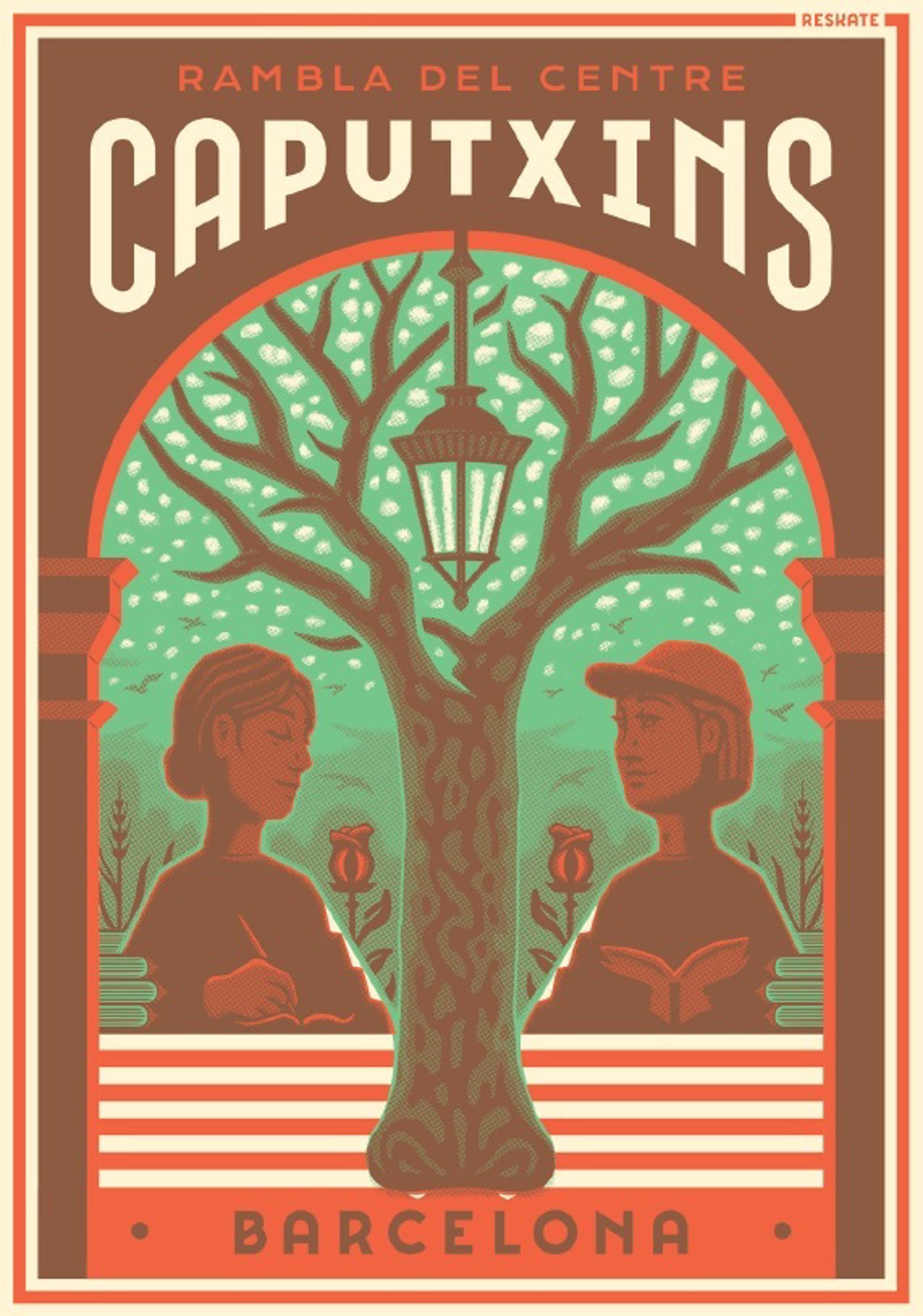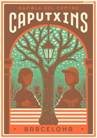 El 5 póster de la colección 'Pòsters de La Rambla' está dedicado a la Rambla dels Caputxins, y sus autores, Reskate Studio, han reflejado la celebración de Sant Jordi en este tramo del paseo, homenajeando los plátanos centenarios.
