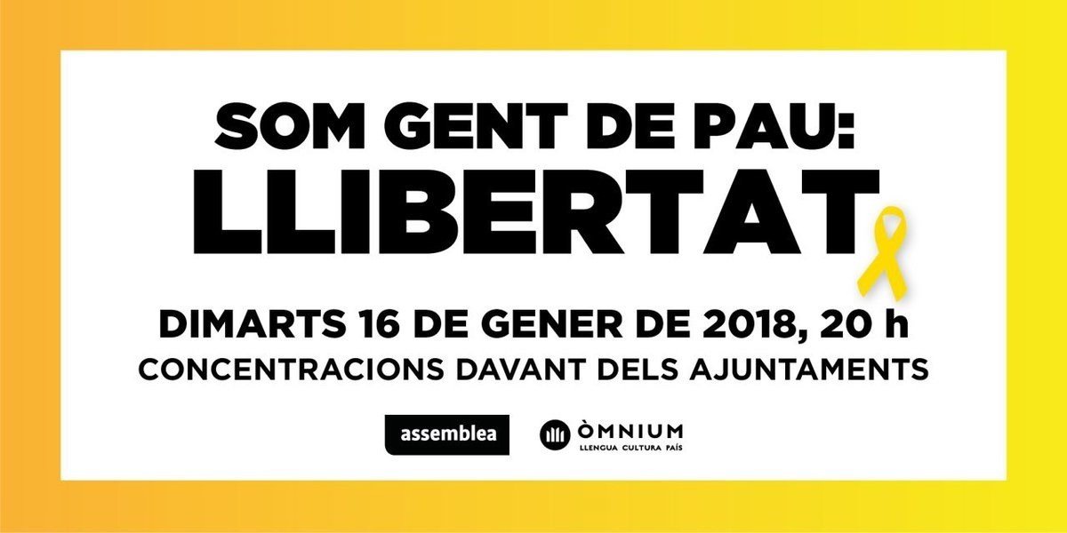 Lo han publicado las entidades soberanistas este sábado a través de sus cuentas de Twitter, en las que han anunciado que la movilización será ante los ayuntamientos de los municipios de Catalunya a las 20.00 horas bajo el lema 'Somos gente de paz: Libertad'.