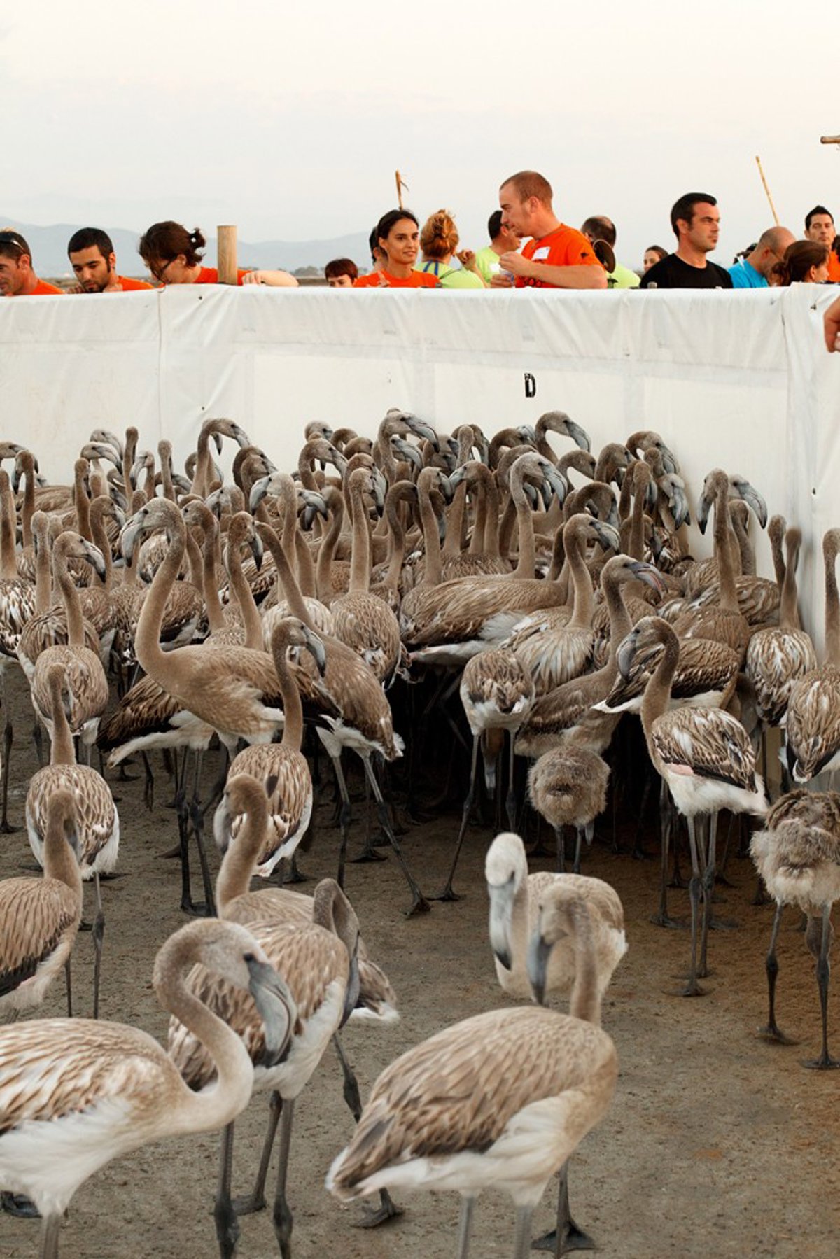 La jornada se inició con el despliegue de los voluntarios en las marismas del Delta, quienes condujeron a los polluelos hasta un corral preparado, donde fueron confinados, etiquetados y se midió la longitud de sus alas, el pico, se comprobó el alimento del buche y se pesaron.
