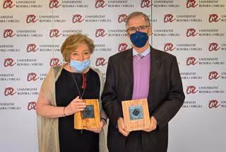 La oncóloga Anna Lluch y el cirujano Joan Viñas tras recibir la Medalla de Honor 2020 de la Xarxa Vives d'Universitats, en la Universitat Rovira i Virgili de Tarragona, este viernes 20 de noviembre del 2020. - XARXA VIVES D'UNIVERSITATS
