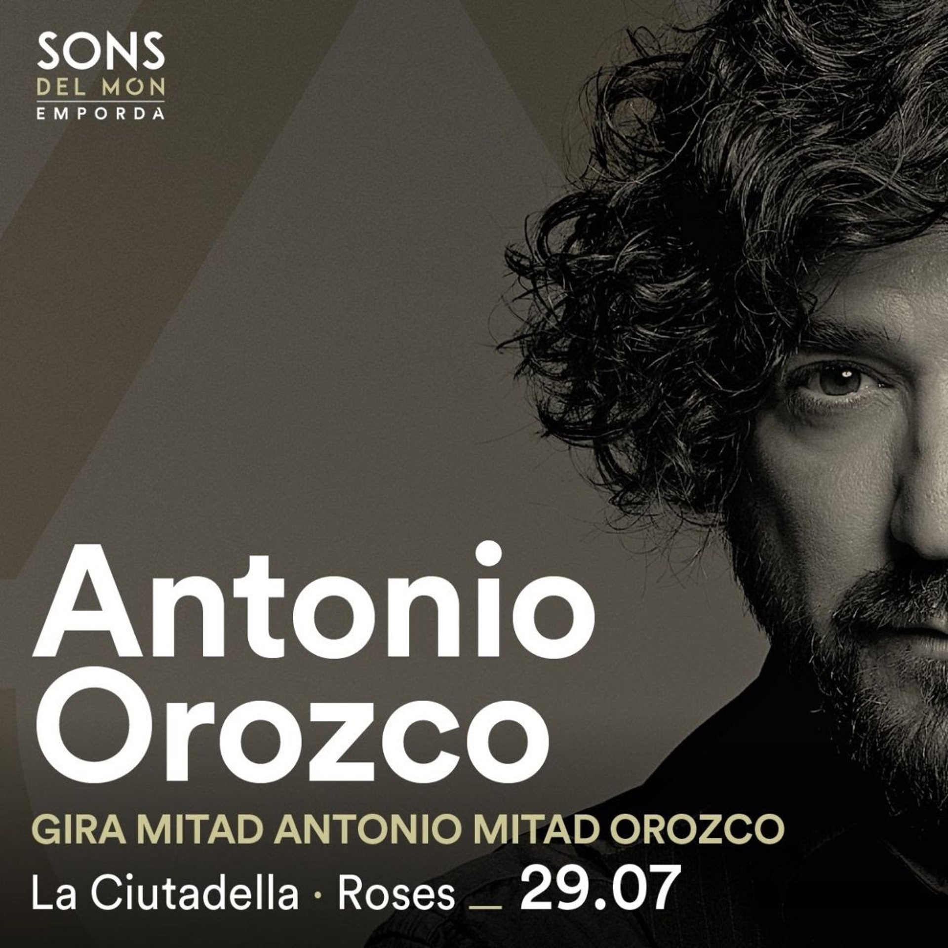 Cartel del concierto del cantante Antonio Orozco en la 16 edición del Festival Sons del Món de Roses (Girona) dentro de su gira 'Mitad Antonio, mitad Orozco' - VIBRA COMUNICACIÓ - FESTIVAL SONS DEL MÓN