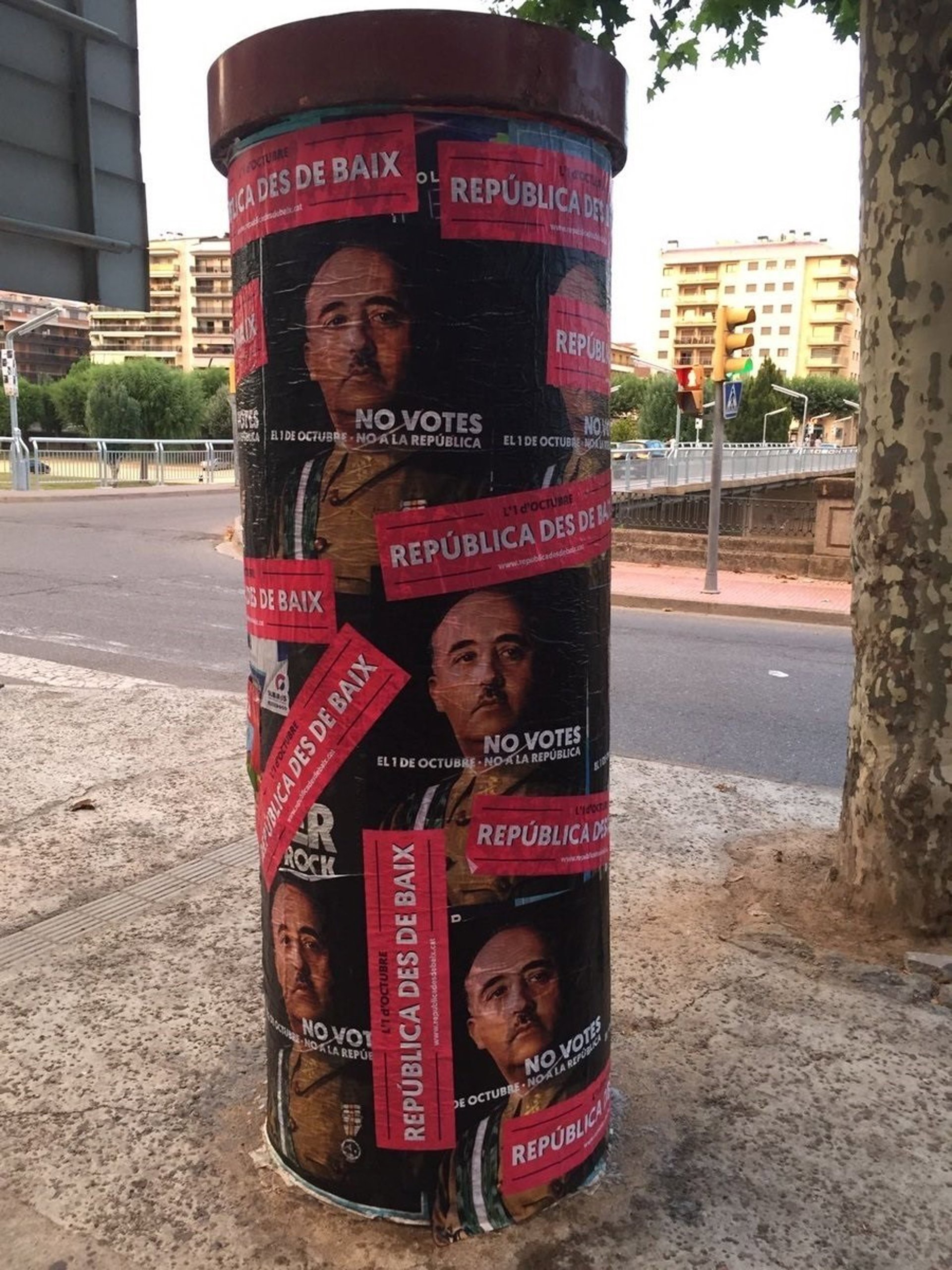 Varias ciudades catalanas han amanecido con carteles con la imagen de Franco y el mensaje 'No votes el 1-O. No a la República' coincidiendo con el aniversario del golpe de estado del 18 de julio de 1936, en una campaña para llamar al voto el día del referéndum.