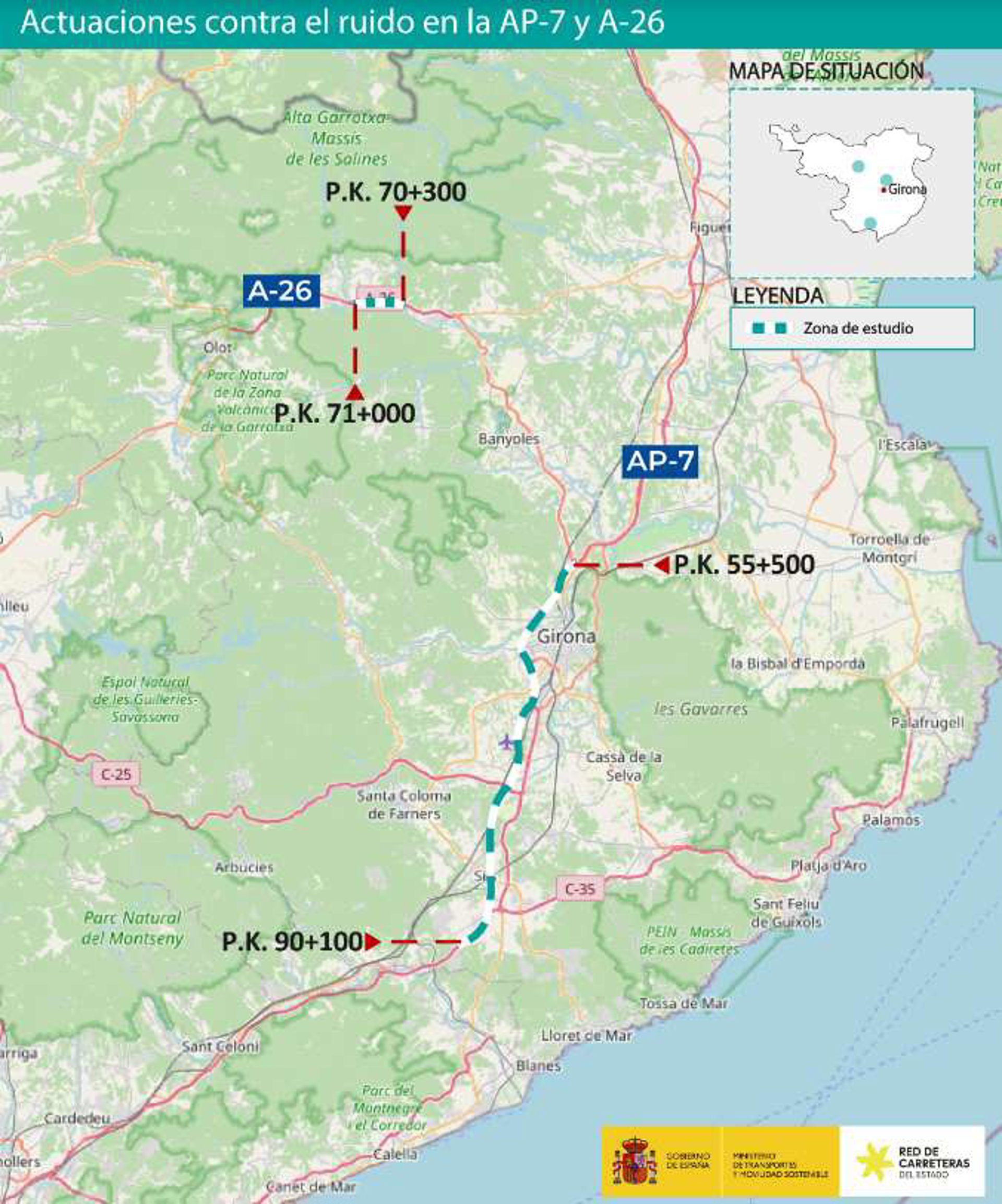El Ministerio de Transportes ha aprobado provisionalmente el proyecto para reducir el ruido en la AP-7 y la A-26 a su paso por Sant Julià de Ramis, Maçanet de la Selva y Argelaguer (Girona) por 17,1 millones de euros.