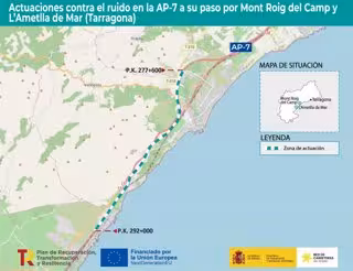 El proyecto incluye la instalación de pantallas acústicas en la margen izquierda de la autopista, cuyos trabajos cuentan con un presupuesto de 10,2 millones, entre los puntos 277,6 y 278,8, al paso de la AP-7 junto a la urbanización El Casalot, en Mont-roig del Camp, y entre los kilómetros 290 y 292, al paso de la autopista por L'Ametlla.