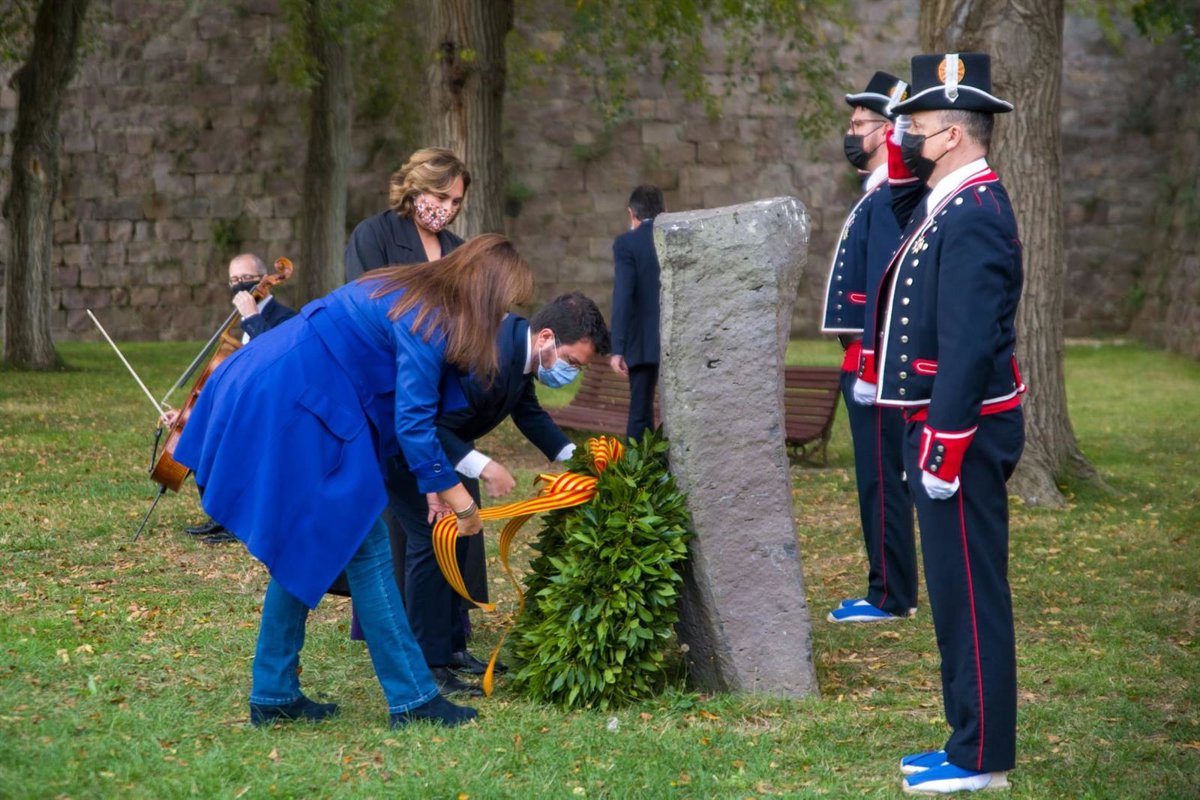 El presidente de la Generalitat, Pere Aragons; la presidenta del Parlament, Laura Borrs, y la alcaldesa de Barcelona, Ada Colau, han hecho este viernes la tradicional ofrenda floral en conmemoración del 81 aniversario del fusilamiento del presidente Lluís Companys.