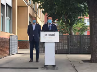 El presidente de la Generalitat, Pere Aragons, y el conseller de Educación, Josep Gonzlez-Cambray (detrás), en una rueda de prensa en la Escola Tanit de Santa Coloma de Gramenet (Barcelona) el primer día del curso 2021-2022 - EUROPA PRESS