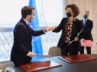 El presidente de la Generalitat, Pere Aragons, ha firmado este viernes con la directora general de la Unesco, Audrey Azoulay, un acuerdo de colaboración --Memorandum of Understanding (MoU)-- hasta 2025 en ámbitos como la educación, la cultura y la ciencia para potenciar el trabajo de la entidad en Catalunya y facilitar la participación de las instituciones catalanas en proyectos internacionales.