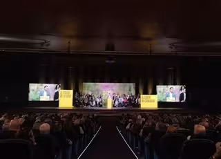 El presidente de la Generalitat y candidato a la reelección, Pere Aragonès, en un mitin en el Palau de Congressos de Barcelona. - EUROPA PRESS