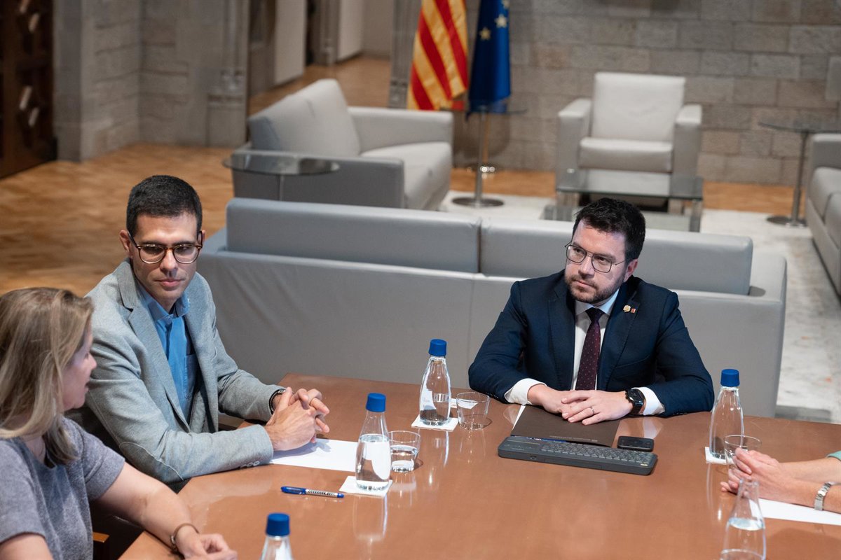 El politólogo de la UPF Marc Sanjaume (i) y el presidente de la Generalitat de Catalunya, Pere Aragons (d), se reúnen con el consejo académico del acuerdo de claridad, a 19 de abril de 2023, en Barcelona, Cataluña (España). La Generalitat de Catalunya - David Zorrakino - Europa Press