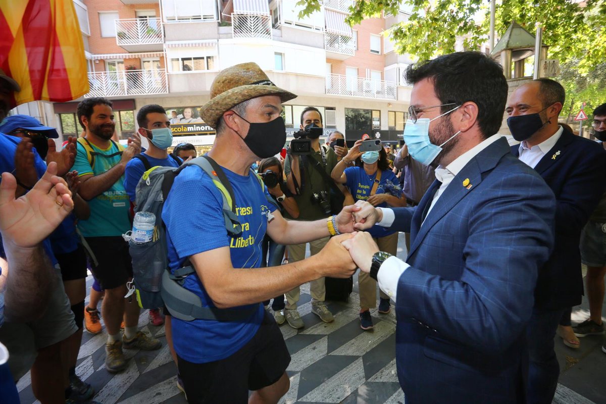 El presidente de la Generalitat, Pere Aragons, ha recibido este sábado al exconseller Jordi Turull en Manresa (Barcelona), donde ha llegado al terminar un tramo de la "travesía por la liberad" que empezó hace una semana y con la que quiere agradecer a quienes le han apoyado a él y al resto de los dirigentes independentistas que estuvieron en prisión.