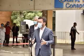 El presidente de la Generalitat, Pere Aragons, en rueda de prensa ante el Hospital Moiss Broggi. - DAVID OLLER - EUROPA PRESS