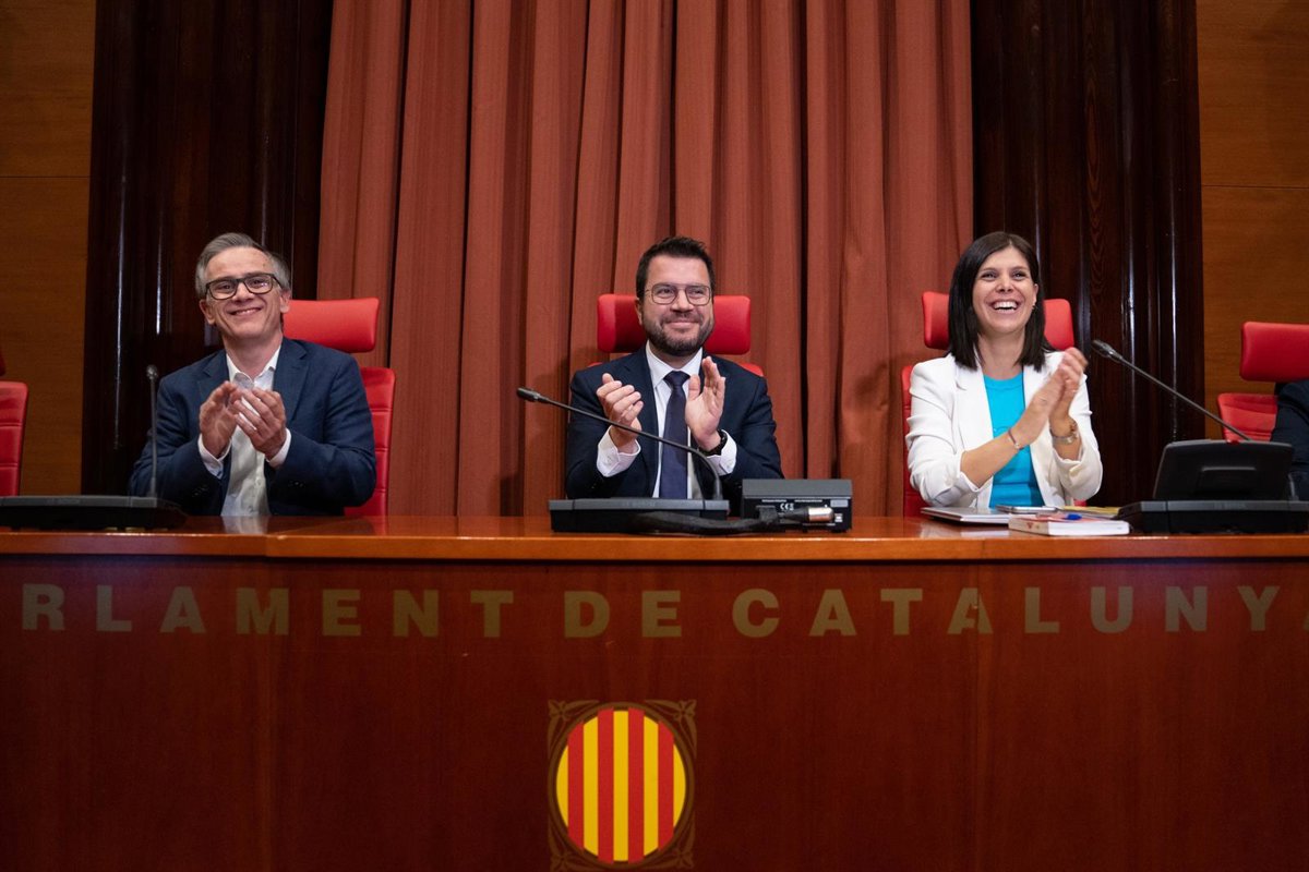 El presidente de la Generalitat, Pere Aragons, junto al presidente del grupo parlamentario de ERC, Josep Maria Jové, y la portavoz y secretaria general adjunta de ERC, Marta Vilalta, en la reunión con ERC antes del Debate de Política General. - DAVID ZORRAKINO - EUROPA PRESS