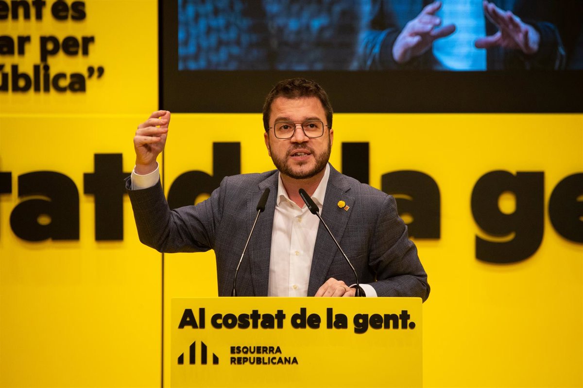 El vicepresidente de la Generalitat en funciones y candidato de ERC a la Presidencia, Pere Aragons, en un mitin de campaña en Badalona. - DAVID ZORRAKINO - EUROPA PRESS - Archivo