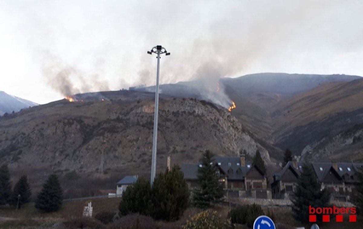 Catorce dotaciones terrestres de bomberos y un helicóptero trabajan en el incendio de pastos de Arties en la Val d'Aran (Lleida), declarado el domingo pasadas las ocho de la tarde.