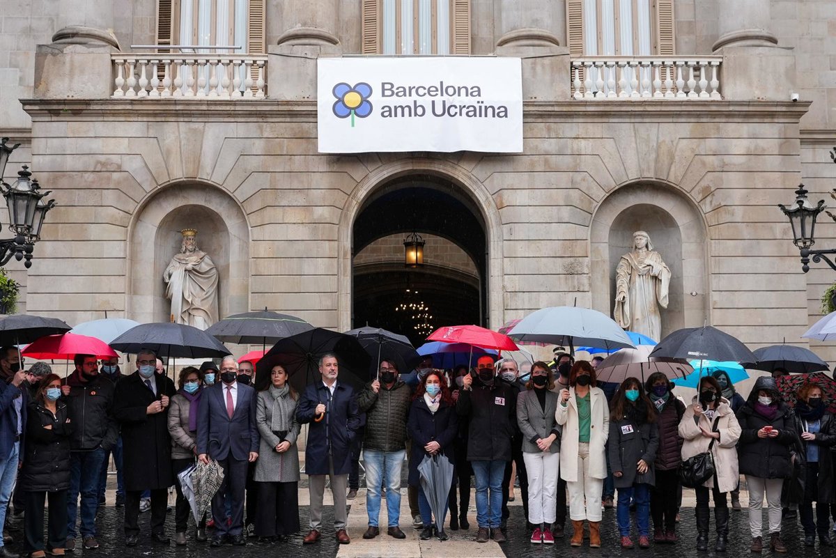La corporación municipal del Ayuntamiento de Barcelona ha guardado cinco minutos de silencio este miércoles al mediodía en la plaza Sant Jaume, ante la fachada del consistorio, en solidaridad con el pueblo ucraniano tras el ataque de Rusia, que empezó el pasado 24 de febrero.