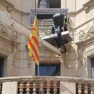 El marcador está encabezado con la leyenda 'Per democràcia, votarem! Referèndum 2017' y se ha colgado junto a una bandera independentista en un balcón.