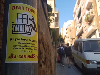 Los carteles, escritos en inglés y dirigidos a los turistas, exponen razones por las que practicar 'balconing': '¿Sabías que el 'balconing' previene la gentrificación?', señalan, y aseguran que mejora la calidad de vida de los vecinos, entre otras afirmaciones.